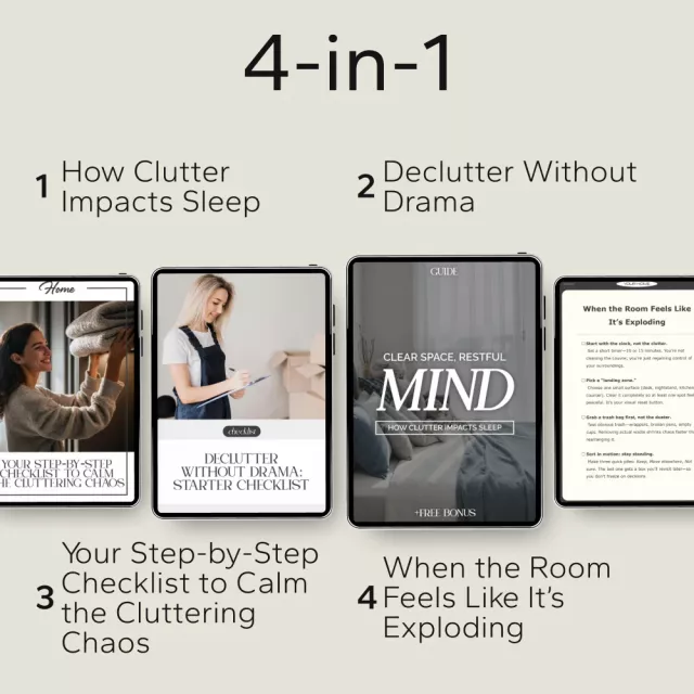 The No-Panic Declutter Toolkit includes four powerful resources that will take the panic out of decluttering and help you create a calm, organized environment: