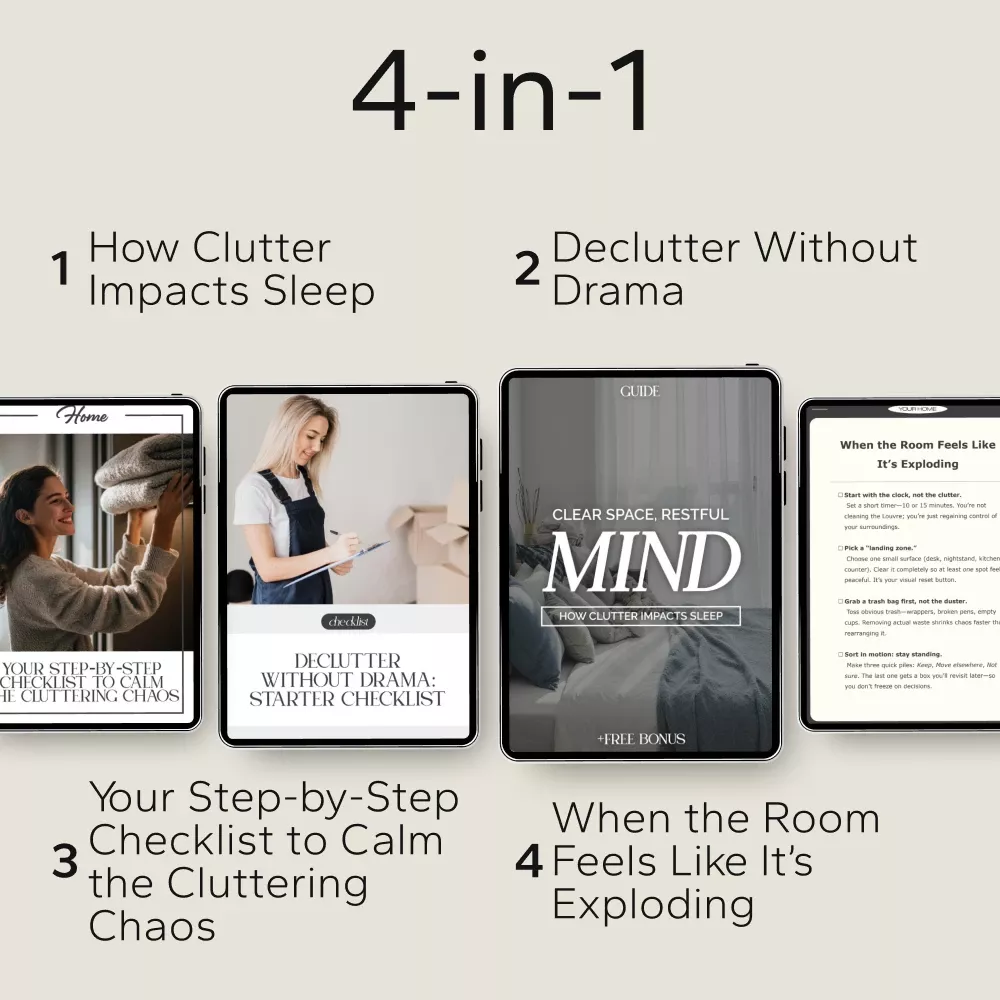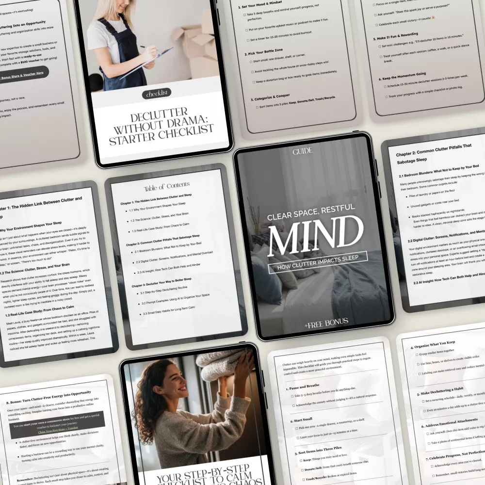 • Your Step-by-Step Checklist to Calm the Cluttering Chaos—A detailed, actionable guide that walks you through each step of the decluttering process.