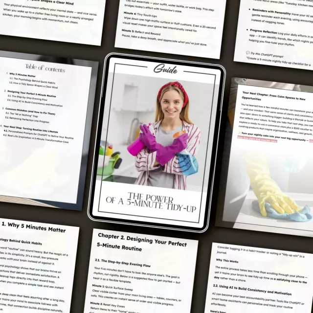 Unlike typical cleaning checklists, The Power of a 5-Minute Tidy-Up combines psychology, habit design, and modern tools like AI to help you build real consistency. It’s not about perfection—it’s about progress, presence, and peace of mind.