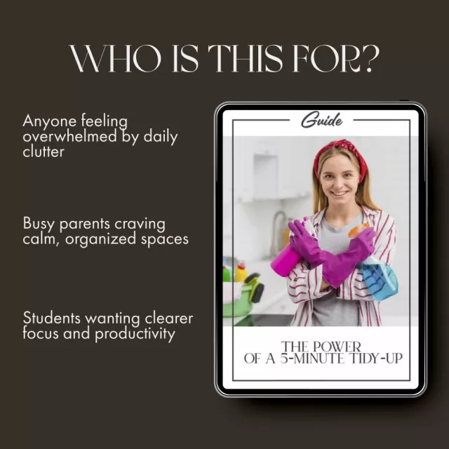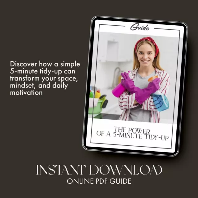 Discover the secret to waking up in a clean, calm space every single morning. The Power of a 5-Minute Tidy-Up is a digital guide that shows you how to create a 5-minute nightly tidy up routine—a simple yet powerful habit that clears your mind, resets your space, and helps you start the next day with focus and ease. Designed for busy people who crave calm without committing to hours of cleaning, this guide turns tidying into a peaceful nightly ritual rather than a chore.