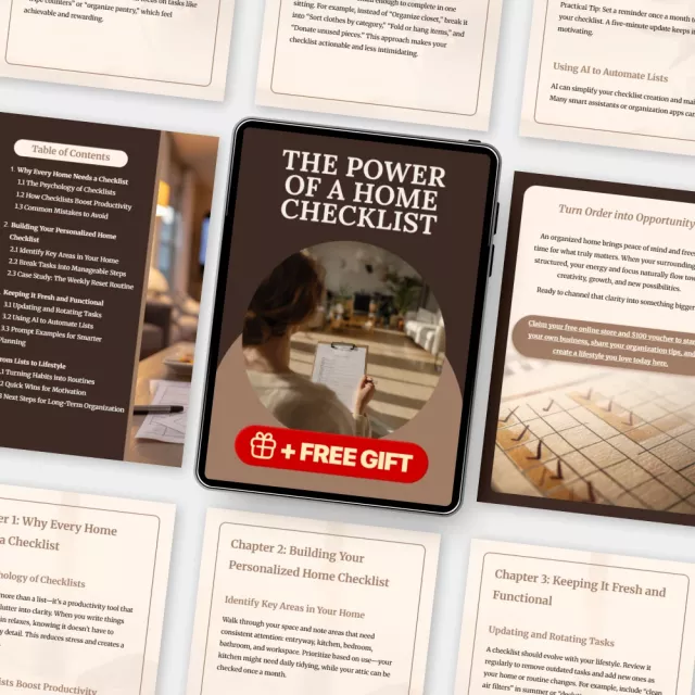 Unlike generic printable checklists, this digital eBook blends psychology, practicality, and technology to help you design a checklist that truly fits your lifestyle. You’ll learn how to adapt your system as life changes, keeping your home functional, peaceful, and productive all year long.