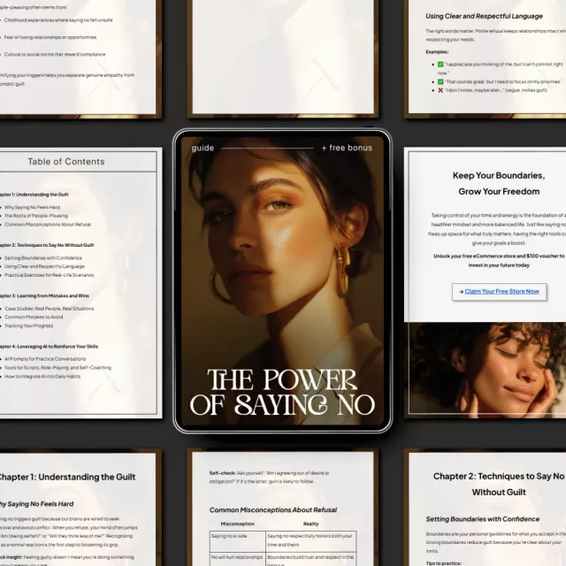 Unlike generic self-help resources, The Power of Saying No blends psychology, practical scripts, and modern AI-powered tools. You don’t just read about boundaries, you practice them. With built-in AI prompts and role-play scenarios, you get a unique, interactive way to strengthen your confidence daily. It doesn’t just tell you how to stop feeling guilty saying no, it trains you to do it in real situations, step by step.