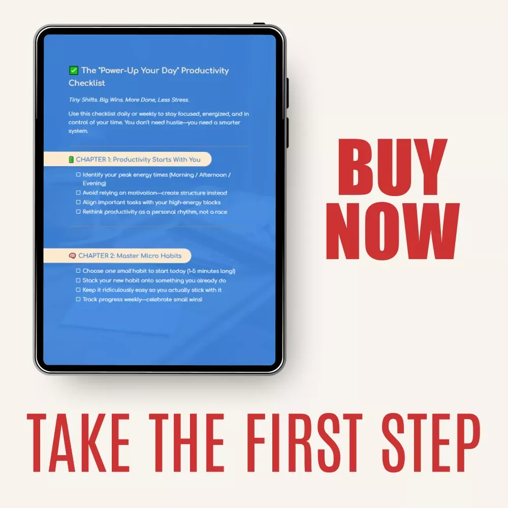 Unlike other productivity resources that offer generic advice, the “Power-Up Your Day” Productivity Checklist is tailored to meet you where you are. It focuses on practical, sustainable strategies that you can start using immediately. With a focus on micro habits, personalized productivity rhythms, and actionable planning techniques, this checklist is designed to help you make lasting changes, not just quick fixes. Plus, the bonus section offers an opportunity to turn your productivity into profit—an added bonus that sets this guide apart from others!