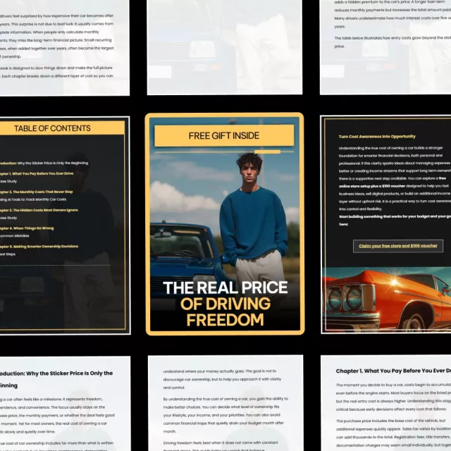 The Real Price of Driving Freedom is a digital ebook you can download instantly and read at your own pace. If you want clarity, control, and a realistic picture of car ownership before it costs you more than expected, this guide is for you. Download now and take the first step toward informed, confident driving decisions.