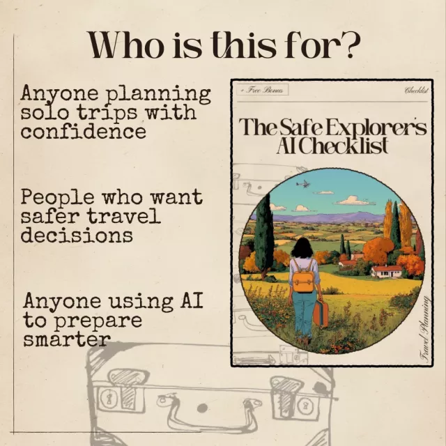 Travel with confidence and make smarter safety decisions using AI. Download The Safe Explorer’s AI Checklist today and give yourself the peace of mind every solo traveler deserves.