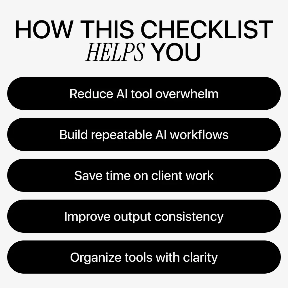 Unlike generic AI tool lists, this checklist focuses on decision-making, workflows, and long-term usability. You’re not told which tools to buy. Instead, you’re guided on how to choose, combine, and reuse tools based on your niche, clients, and goals. It’s flexible, practical, and built for real freelance work.
