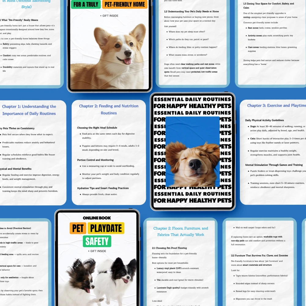 This bundle is perfect for pet lovers looking to elevate their home and daily routines to ensure their pets’ well-being. Whether you’re looking to improve your pet’s comfort at home or want expert advice on pet safety during playdates, this bundle has it all. It’s the only resource you need to create a truly pet-friendly space and establish daily habits that will keep your pets healthy, happy, and safe.