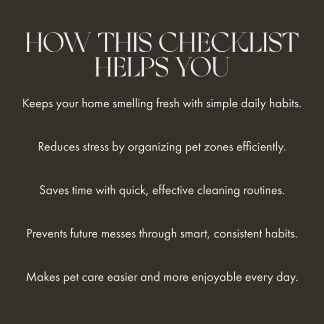 Unlike generic cleaning guides, this checklist is written specifically for pet parents—by someone who understands the daily dance of fur, paws, and playtime chaos. It’s friendly, realistic, and actually works. With focused sections on routine, organization, and odor control, you’ll finally know exactly how to manage pet mess in living areas—without stress or overwhelm.