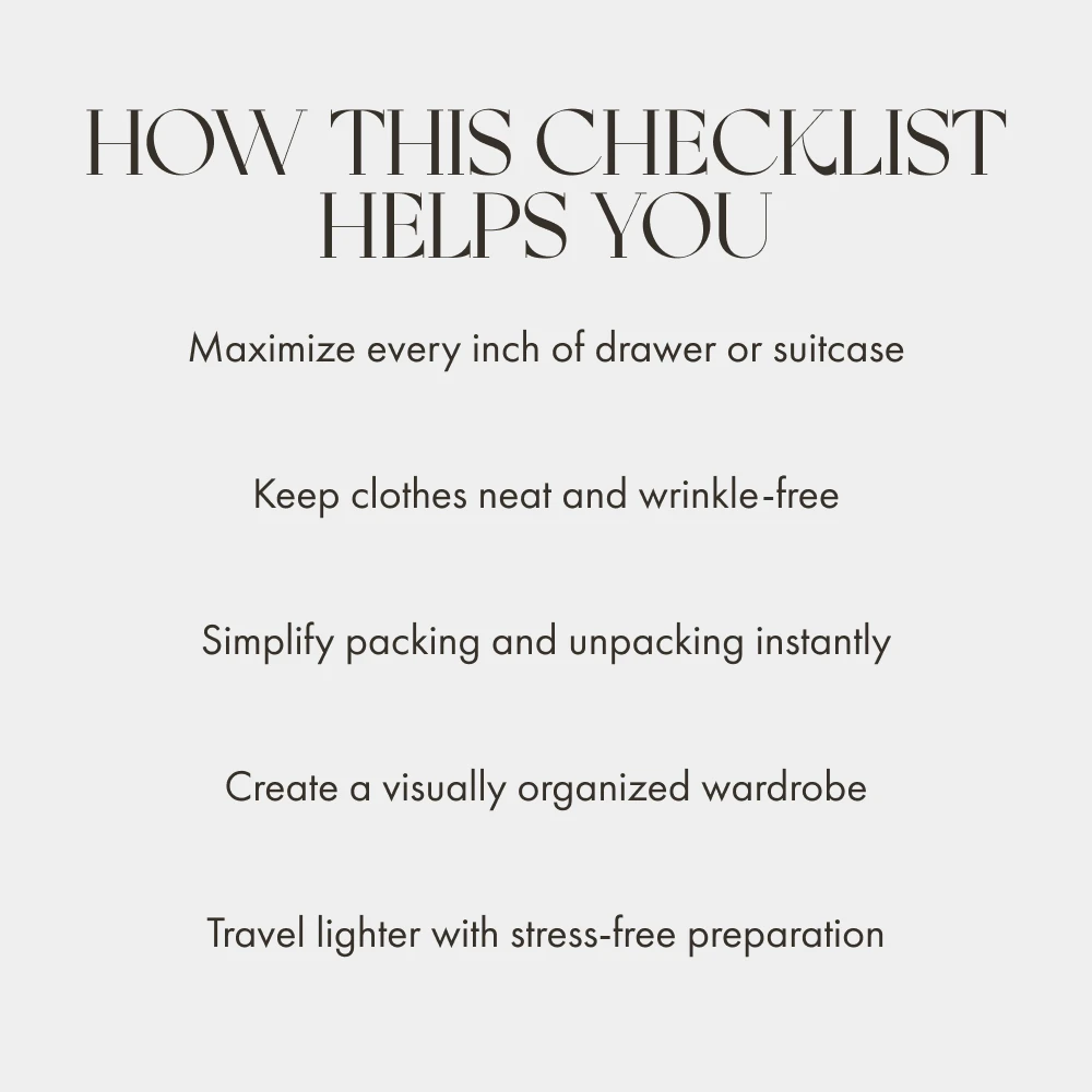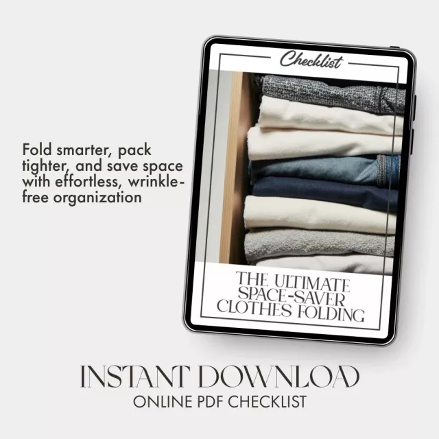 Stop wasting time repacking and refolding. Download The Ultimate Space-Saver Clothes Folding Checklist now and transform your packing and organizing routine forever. Keep your clothes neat, wrinkle-free, and travel-ready—all while saving space and stress. Your clutter-free lifestyle starts today!