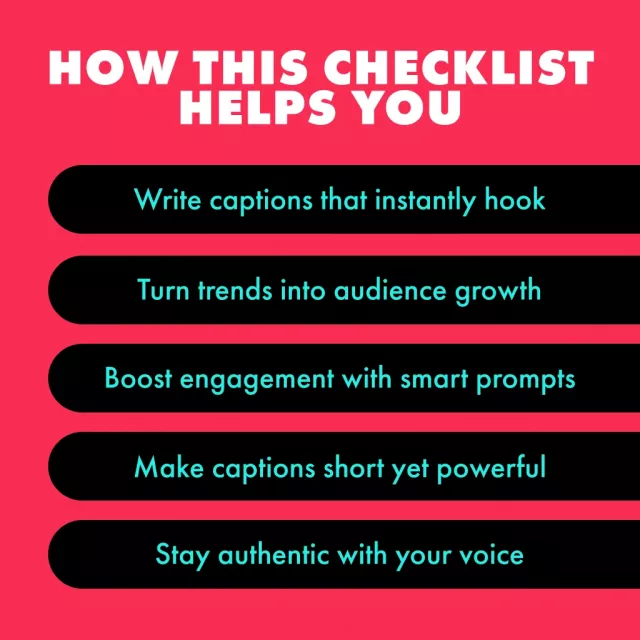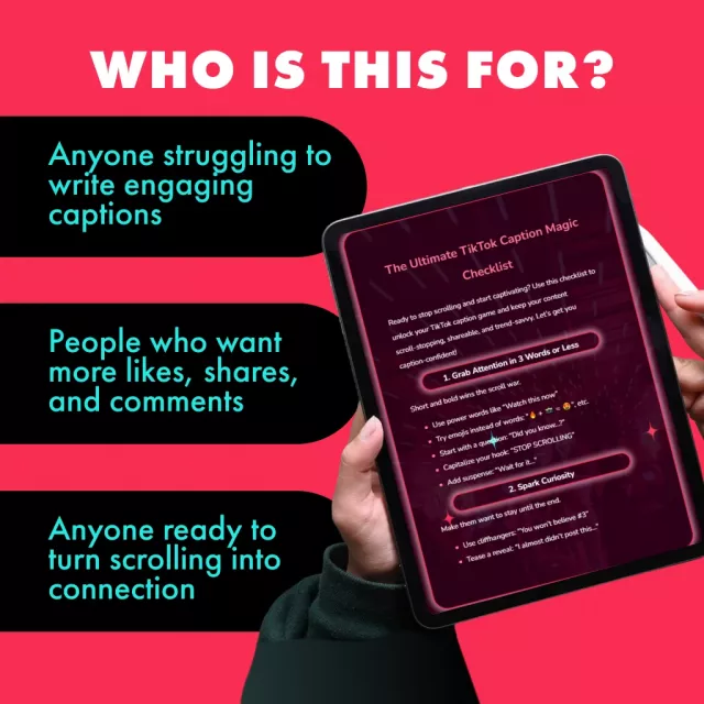 Don’t let another TikTok post go unnoticed. Download The Ultimate TikTok Caption Magic Checklist today and start writing captions that grab attention, spark curiosity, and drive engagement. Turn your videos into must-watch content with scroll-stopping captions that convert views into followers!