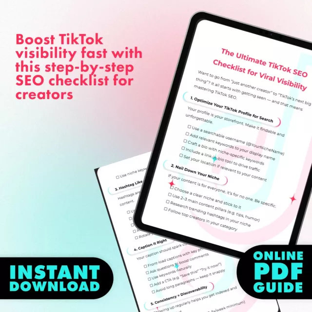 Ready to unlock the secret to going viral on TikTok? The Ultimate TikTok SEO Checklist for Viral Visibility is your all-in-one digital download designed to help creators, brands, and entrepreneurs get discovered faster and rank higher on TikTok. Packed with proven tiktok seo tips, this easy-to-follow resource takes the guesswork out of optimizing your profile, captions, hashtags, and content strategy—so you can focus on creating videos that grab attention and grow your audience.