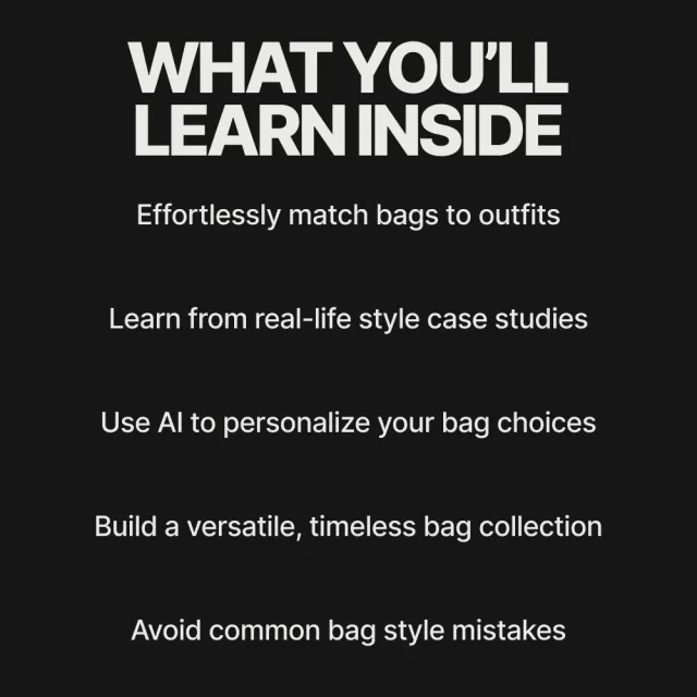 • Chapter 4: Taking Your Bag Game to the Next Level – Build a capsule bag collection, spot trends with AI, and take actionable steps to elevate your bag style.