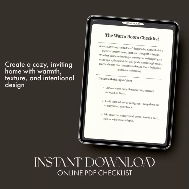 Turn your chilly or uninviting room into a sanctuary of warmth with The Warm Room Checklist—a beautifully designed, easy-to-follow digital download that teaches you how to make a room feel warmer. Whether you’re styling a new apartment, refreshing your bedroom, or enhancing your living room’s comfort, this guide helps you layer warmth, light, and texture effortlessly. No design degree required—just simple, thoughtful steps to create a space that feels as good as it looks.