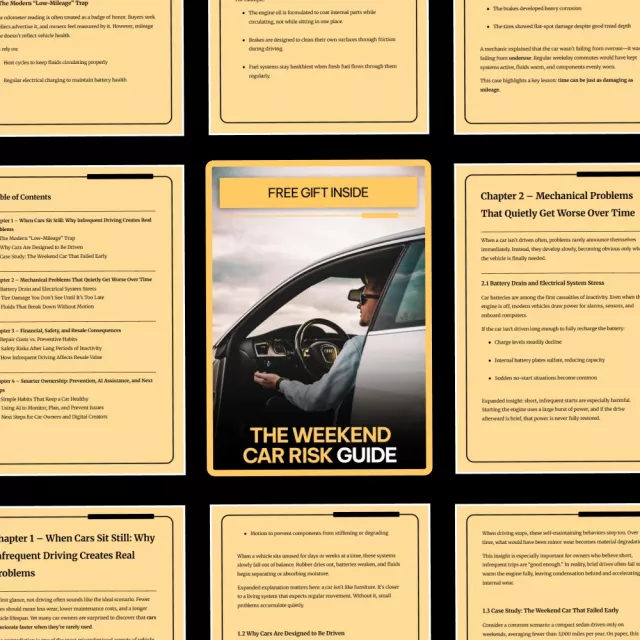 Your car may look perfectly fine sitting in the driveway all week—but what’s happening beneath the surface could be quietly costing you money, safety, and resale value. The Weekend Car Risk Guide is a practical, easy-to-follow digital guide that reveals the hidden problems from not driving a car often and shows you how to prevent them before they turn into expensive repairs. Whether your vehicle is a weekend-only ride, a secondary car, or rarely used due to remote work, this guide helps you understand what inactivity really does to a modern car.