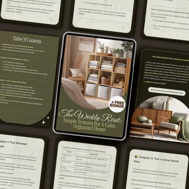 Unlike typical cleaning checklists, The Weekly Reset blends practical home organization with mindset shifts and gentle accountability. You’ll not only learn what to do, but also how to feel good doing it—supported by smart tech, psychology, and real-life examples.