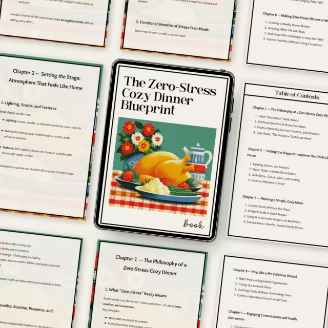 • Chapter 1 — The Philosophy of a Zero-Stress Cozy Dinner: What “Zero-Stress” Really Means, emotional and practical benefits, plus a heartwarming case study