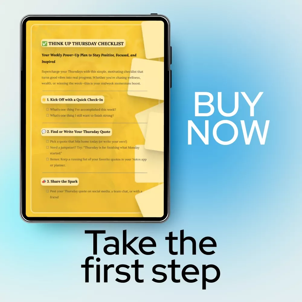 Looking for a simple way to boost your mindset and tackle your week with renewed energy? The Think Up Thursday Checklist is your secret weapon to stay focused, positive, and inspired—every Thursday. This downloadable guide offers a powerful, quick-reset plan designed to help you reflect, set intentions, and infuse your week with the motivational drive to succeed. Whether you’re pursuing wellness, wealth, or simply a productive week, this checklist will help you build momentum to keep going strong until Friday!