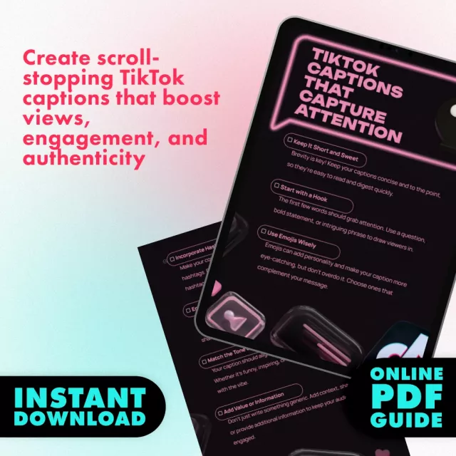 Want to boost your TikTok engagement with captions that stop the scroll? TikTok Captions That Capture Attention is your ultimate checklist designed to help creators, influencers, and businesses craft captions that instantly grab attention and keep viewers engaged. Whether you’re trying to grow your audience, increase interaction, or simply stand out on TikTok, this digital download makes it simple to write captions that work. Packed with proven strategies and practical tips, this easy-to-follow checklist ensures your captions complement your content and maximize visibility.