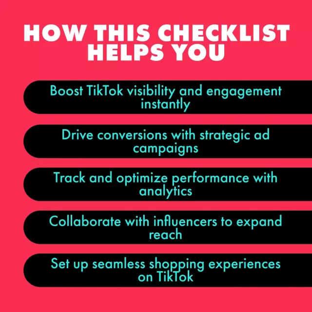 This checklist isn’t just another guide—it’s your roadmap to transforming your TikTok strategy. Whether you’re looking to build a strong online presence or drive direct conversions, each step is designed to help you maximize the effectiveness of your TikTok efforts. By using the right marketing tools and implementing the strategies outlined, you can: