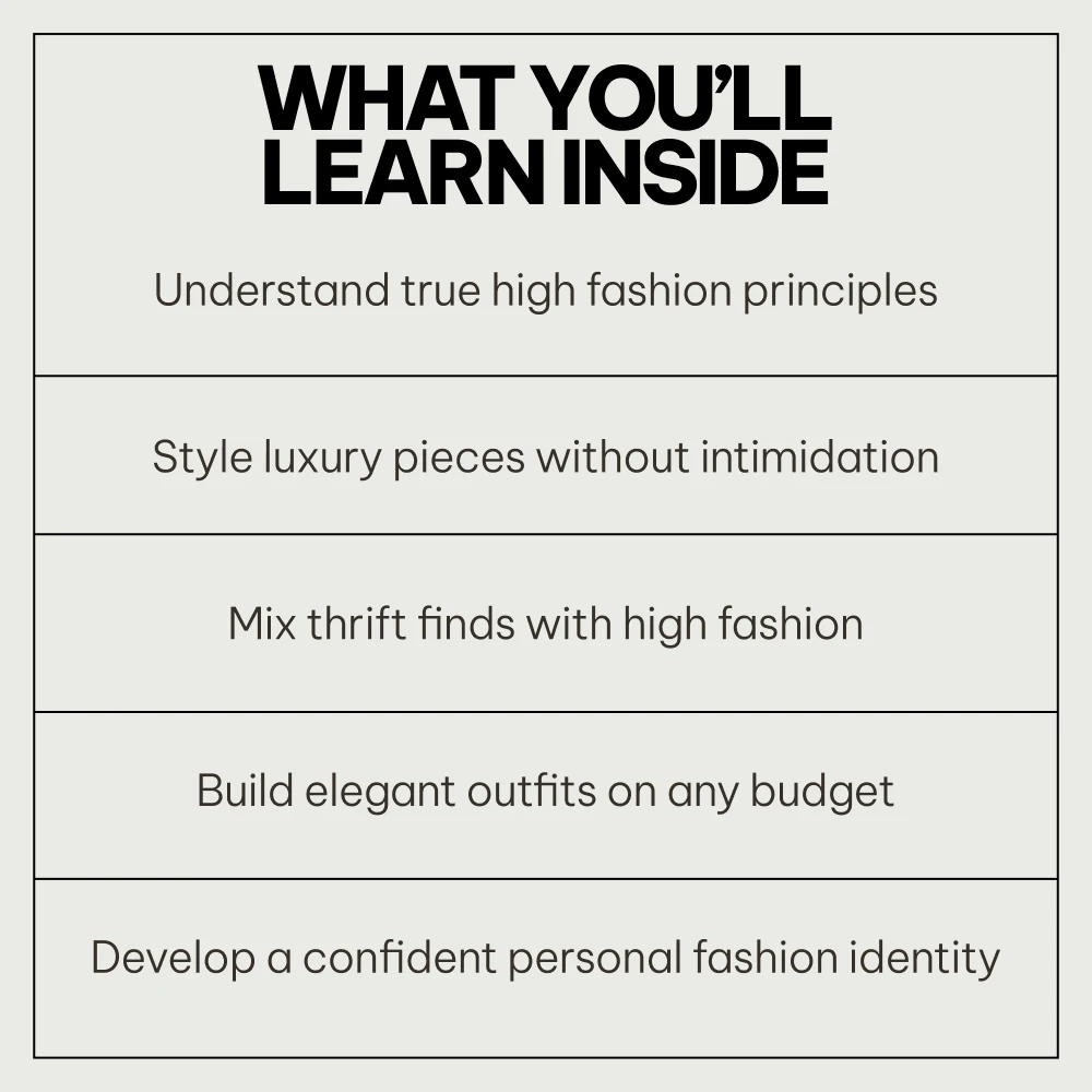 the tips on mixing high fashion with everyday style are priceless! now i can create outfits that exude effortless chic without compromising on style or quality. highly recommend this for anyone looking to elevate their wardrobe.