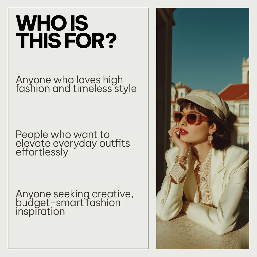 This digital bundle is designed for fashion lovers of all levels—from those just starting their fashion journey to seasoned pros looking for new tips and inspiration. It’s ideal for anyone who wants to understand the nuances of high fashion and gain practical tools for incorporating those techniques into their own style. If you’re passionate about mastering high fashion and bringing your personal flair to every outfit, this bundle is for you!