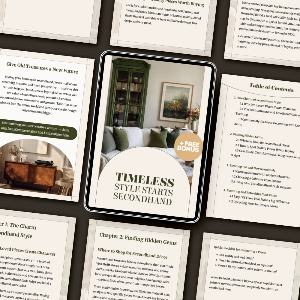 Transform your home, save money, and design with purpose. Download “Timeless Style Starts Secondhand” today to unlock the creative power of thrifted decor and bring timeless character to every corner of your home. Your dream interior — full of charm, story, and sustainability — starts here.