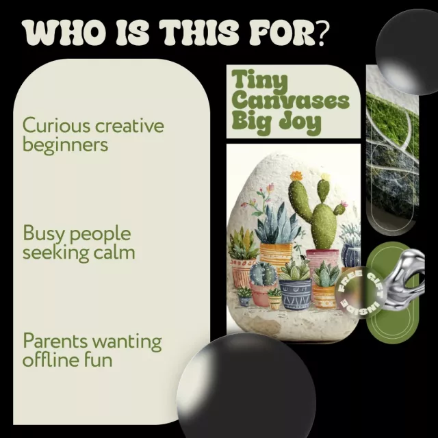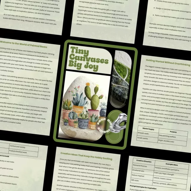 Tiny Canvases Big Joy is a beautifully simple digital guide designed to help you fall in love with painted rocks—without pressure, perfectionism, or expensive supplies. This guide invites you into a relaxing, creative world where small stones become tiny works of art and moments of calm. Whether you are brand new or returning to creativity after a break, this guide makes painting rocks feel approachable, playful, and rewarding.