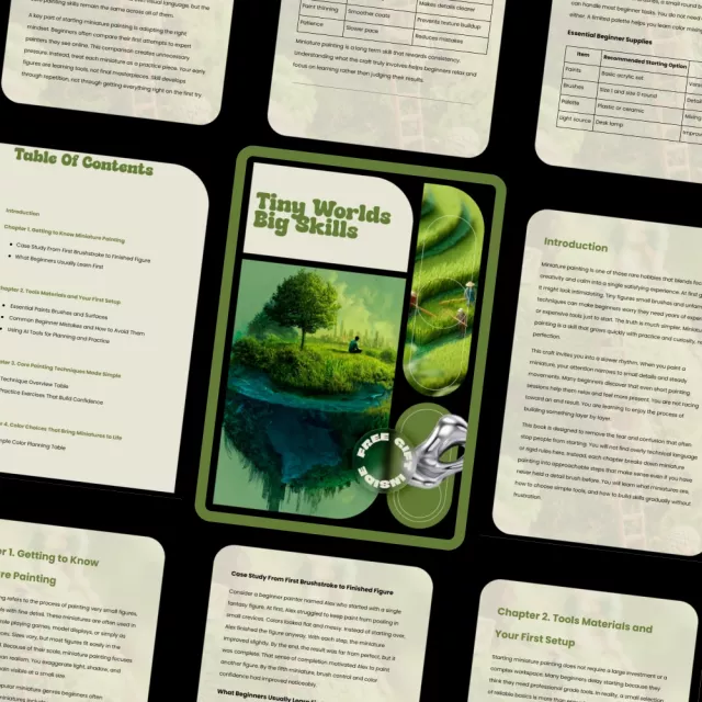 Step into the rewarding world of miniature painting with Tiny Worlds Big Skills, a beginner-friendly ebook designed to turn curiosity into confident creativity. Whether you are holding a brush for the first time or restarting after frustration, this guide breaks the art of miniature painting down into simple, achievable steps. Clear explanations, practical tables, and real learning examples make miniature painting for beginners feel approachable, fun, and motivating from page one.