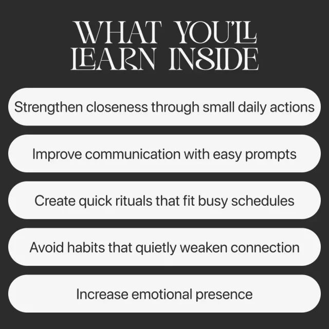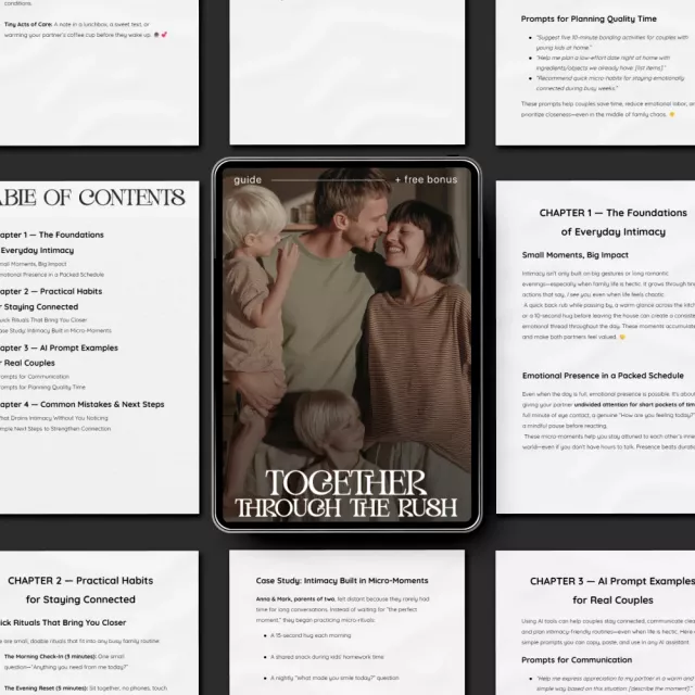 This digital guide is perfect for couples with full schedules, parents balancing work and home life, partners in long-term relationships looking to rekindle closeness, or anyone wanting simple, realistic ways to stay connected without adding stress.