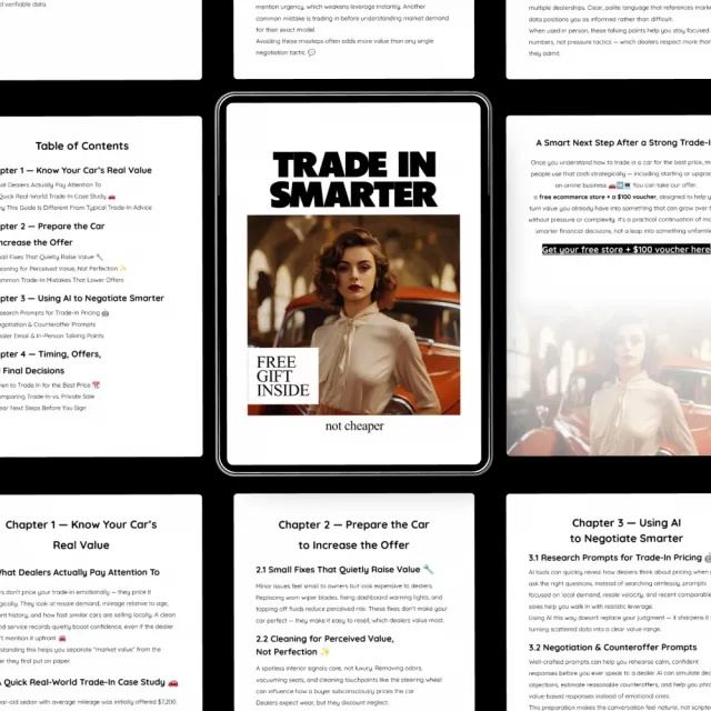 If youβve ever wondered whether you left money on the table when trading in your car, this guide was made for you. Trade-In Smarter, Not Cheaper is a clear, modern, and practical digital guide that shows you exactly how to trade in a car for best price without stress, guesswork, or awkward dealer pressure. Instead of outdated tips, youβll learn how dealerships really evaluate trade-ins, how small preparation steps can increase offers, and how to use AI-powered prompts to negotiate with confidence.