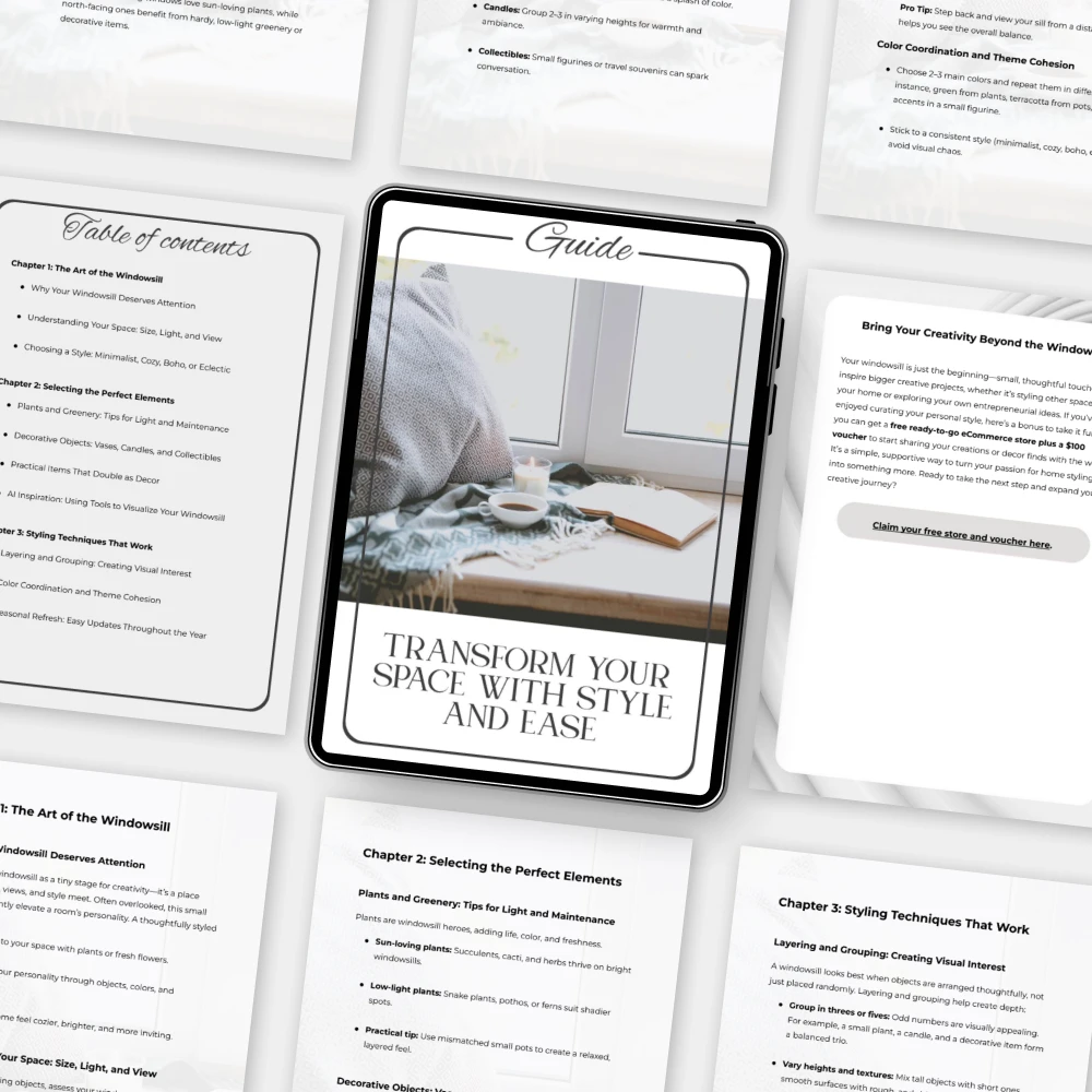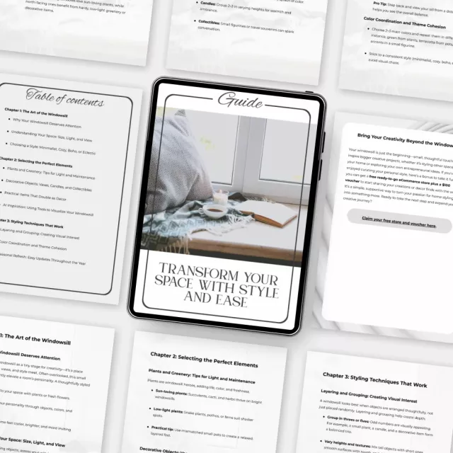 Give your home the effortless charm it deserves with Transform Your Space with Style and Ease — a beautifully crafted digital guide that shows you how to style a windowsill like a pro. Whether your vibe is cozy and rustic, modern and minimalist, or a mix of everything in between, this guide walks you through every step to bring personality, beauty, and balance to one of the most overlooked areas of your home.