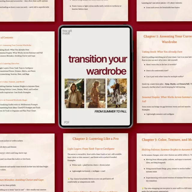 Struggling with what to wear when summer fades but fall hasn’t fully arrived? Transition Your Wardrobe From Summer to Fall is a practical, modern digital guide designed to help you dress with confidence during the trickiest style season of the year. This guide removes the overwhelm from getting dressed by showing you exactly how to transition wardrobe from summer to fall using pieces you already own, smart layering strategies, and even AI-powered tools to plan outfits visually. Whether your closet feels cluttered or uninspiring, this guide gives you a clear, stylish path forward.