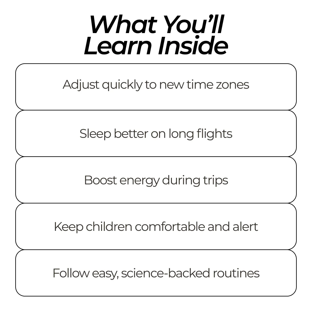 Unlike generic travel tips, this bundle provides actionable steps, scientifically-backed advice, and kid-friendly strategies all in one convenient digital package. It combines wellness, practical hacks, and light-based techniques to ensure you stay energized, focused, and ready for adventure.