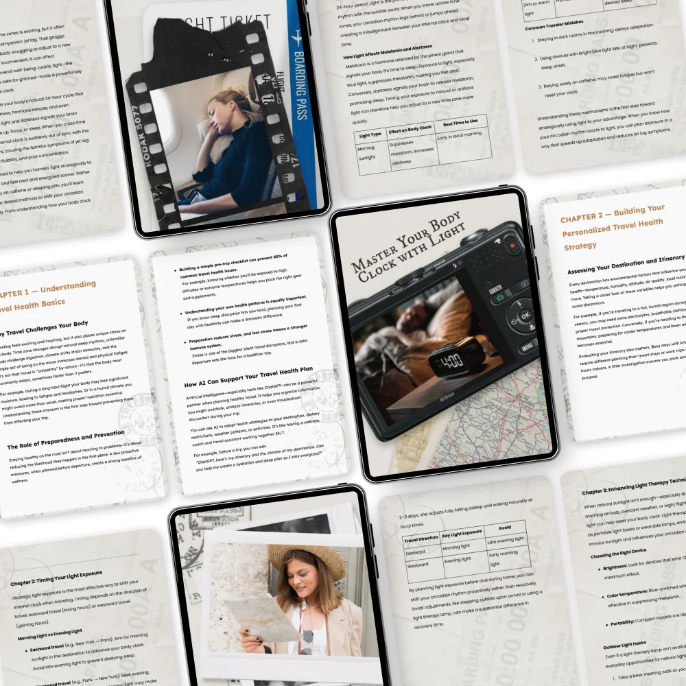 The 'Master Your Body Clock with Light' part of the bundle was so enlightening! 😄 Understanding how light exposure can reset your sleep schedule naturally has made such a difference in overcoming jet lag faster after long flights.