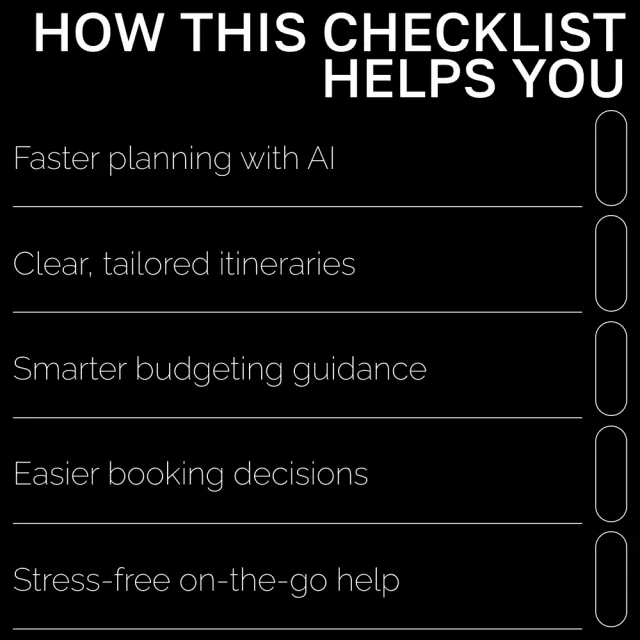 This checklist is perfect for busy travelers, first-time planners, digital nomads, spontaneous adventurers, or anyone curious about how to use ai to plan a trip more effectively. If you want clear direction, structured steps, and plug-and-play prompts, this is your new favorite travel tool.