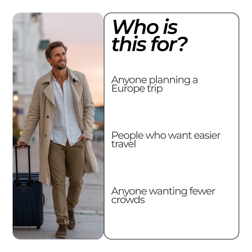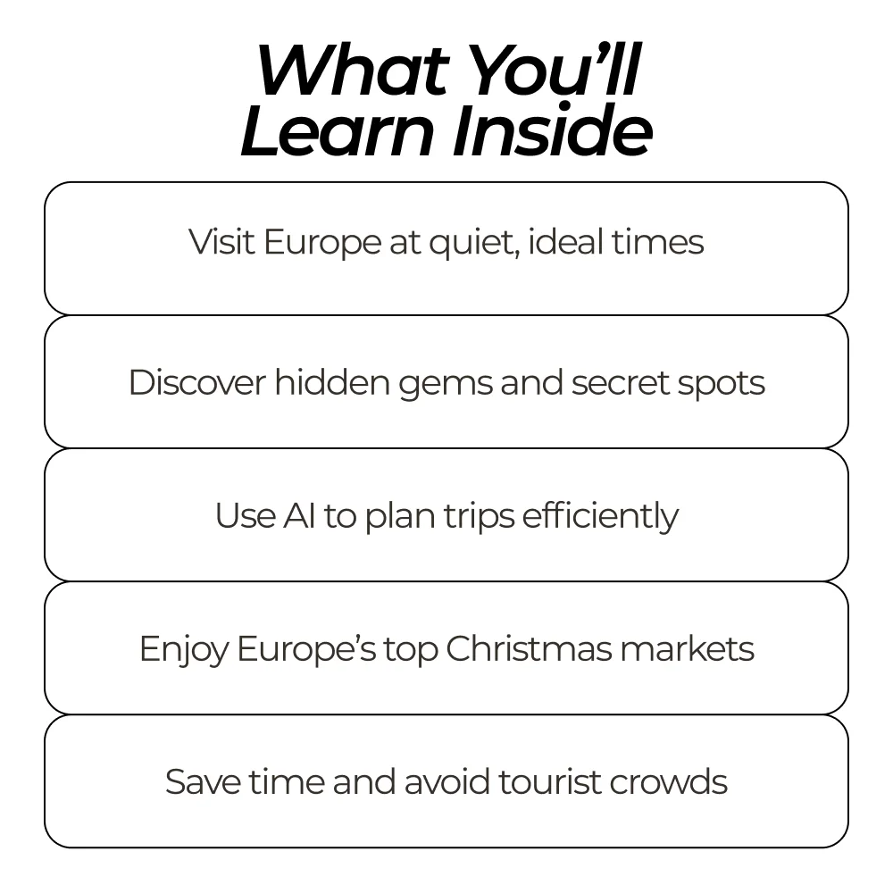 Whether you’re dreaming of quiet cobblestone streets, hidden cultural gems, or the sparkling charm of Christmas markets, this toolkit shows you how to travel smart, plan efficiently, and enjoy every moment. Using the latest tools and insider knowledge, you’ll know exactly when and where to go for the ultimate European experience.