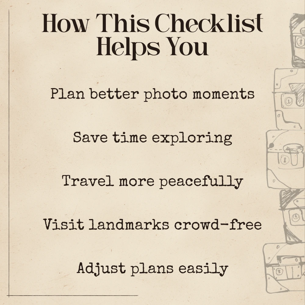 This digital checklist is made for travelers, photographers, digital nomads, and anyone who values time, tranquility, and quality experiences. Whether you’re visiting world-famous icons or hidden gems, you’ll learn to plan with precision using ai that suggests alternative times to visit landmarks — turning busy destinations into peaceful escapes.