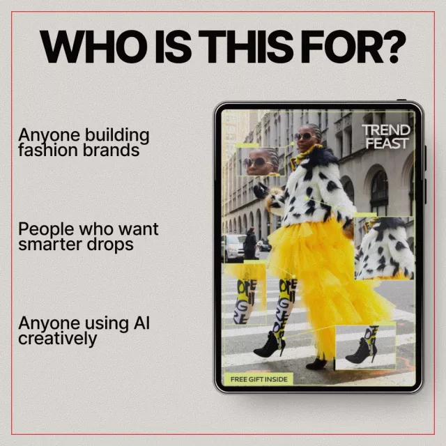 Trend Feast is a smart, practical checklist designed to help fashion brands, designers, and online sellers spot what’s about to trend before it hits the mainstream. Instead of guessing or chasing trends too late, this digital download walks you through a repeatable system that blends human insight with ai fashion trend predictor tools. The result? Better product decisions, stronger drops, and less wasted inventory. Simple, actionable, and built for real-world fashion workflows, Trend Feast turns trend forecasting into a clear, confidence-building process.