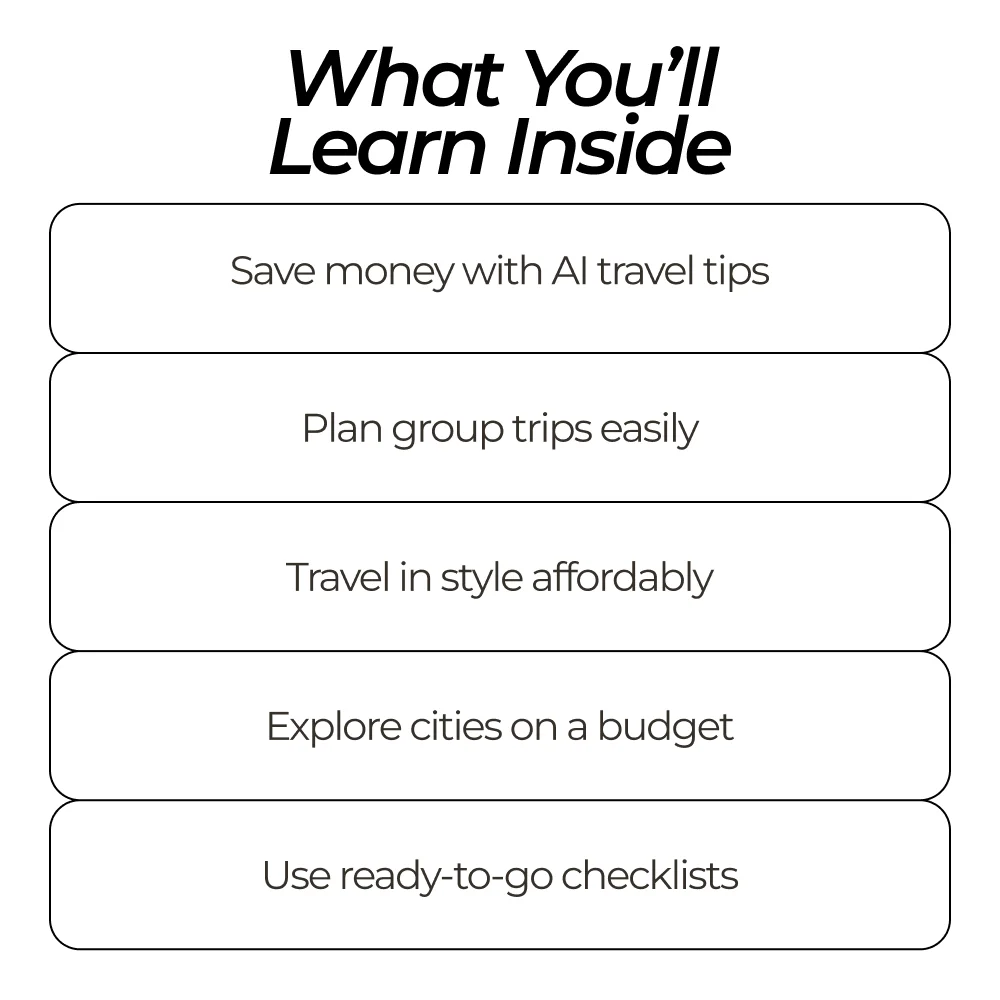 The group travel section helped me organize a weekend getaway without the usual budgeting chaos. The checklists are practical and easy to follow. I did feel like some of the AI examples could’ve gone deeper into advanced strategies, but for most travelers it’s more than enough.