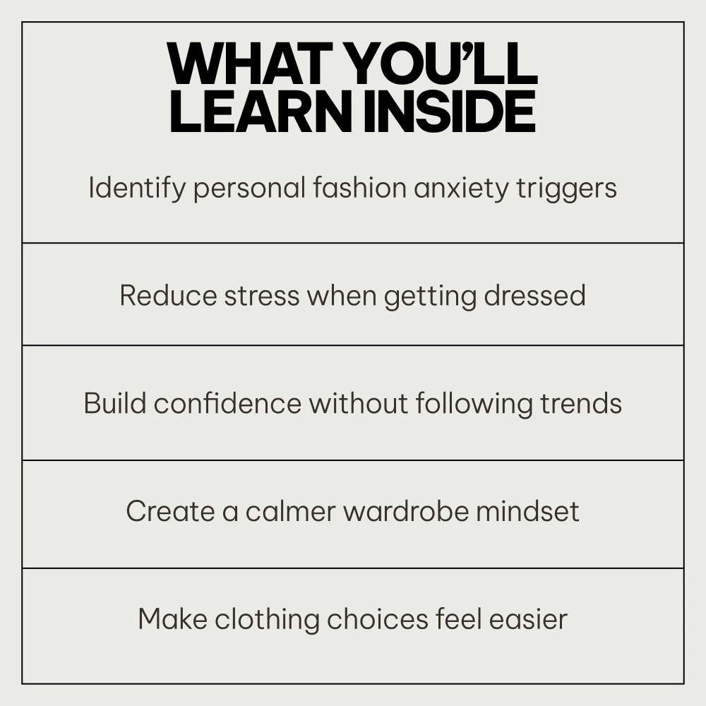 This bundle is for anyone who feels anxious, stuck, or disconnected when getting dressed—whether you’re navigating body changes, lifestyle shifts, or simply questioning your personal style. Unlike typical fashion guides focused on trends or shopping, this resource goes deeper. It focuses on self-awareness, emotional well-being, and understanding what causes fashion anxiety, helping you create lasting change instead of temporary fixes.