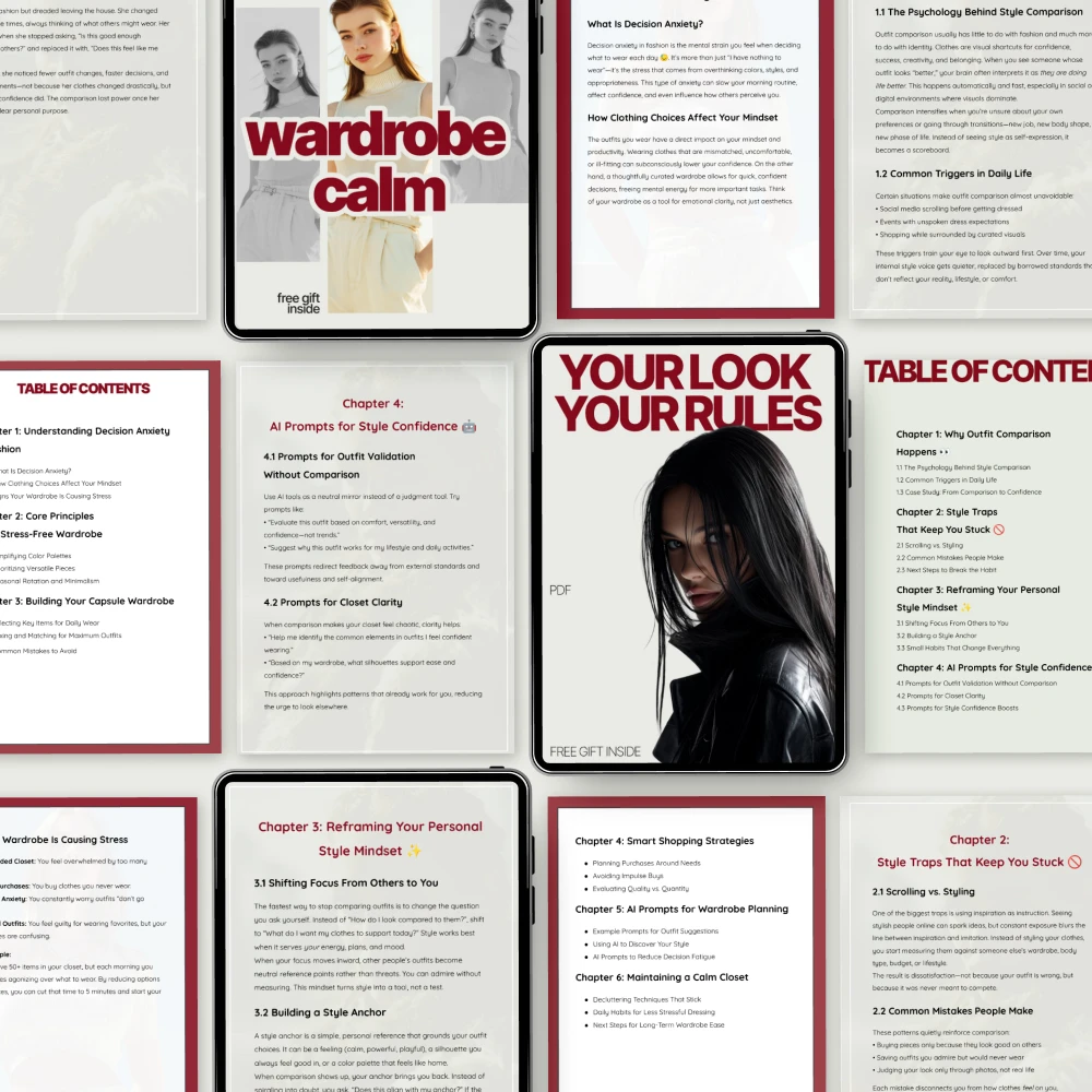 Getting dressed shouldn’t feel overwhelming, frustrating, or emotionally draining. The Understanding Fashion Anxiety Triggers Bundle is a thoughtfully created 3-in-1 digital resource designed to help you understand your relationship with clothes, identify what causes fashion anxiety, and build a calmer, more confident wardrobe experience. This bundle combines gentle guidance, practical tools, and mindset-shifting insights to support you every step of the way—without pressure to follow trends or fit into a fashion “rulebook.”