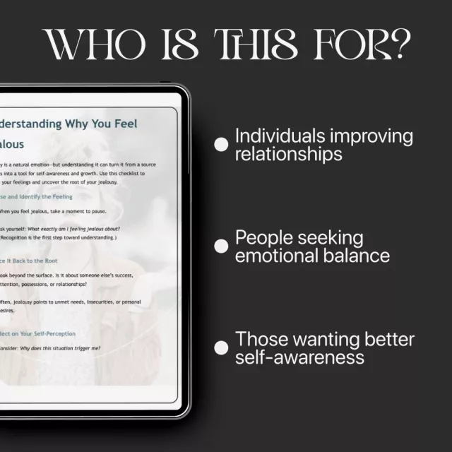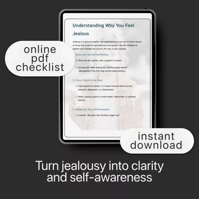 Understanding Why You Feel Jealous is a calm, reflective digital checklist created to help you explore what’s really behind your jealousy and turn it into personal insight. If you’ve ever wondered how to understand why I feel jealous, this simple yet powerful tool guides you through identifying triggers, tracing emotions to their roots, and transforming comparison into clarity. Designed for quick reflection or deeper journaling, it helps you move from self-criticism to curiosity—so you can grow instead of feeling stuck.