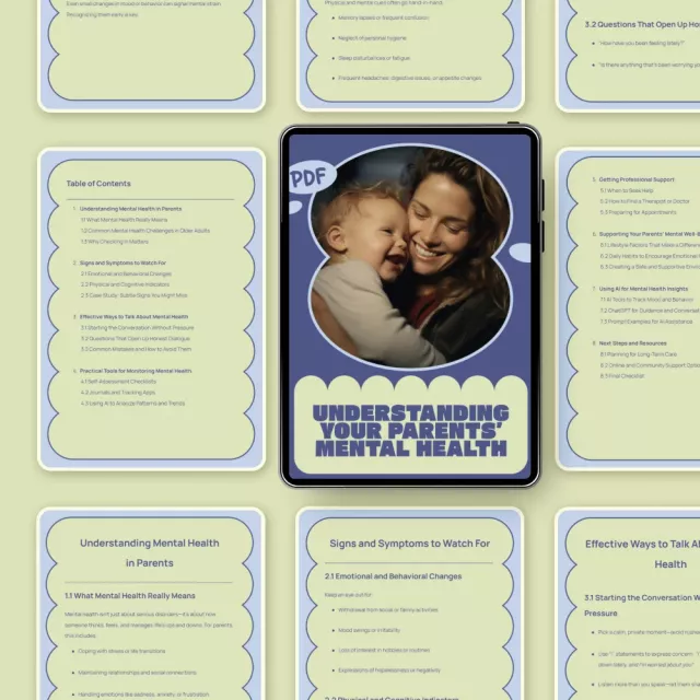 Watching your parents age can bring questions, concerns, and moments of uncertainty—especially when it comes to their emotional and mental well-being. Understanding Your Parents’ Mental Health is a thoughtfully written ebook designed to help you recognize changes early, start supportive conversations, and take meaningful action with confidence. This practical guide breaks down complex topics into simple, compassionate steps so you can better understand what’s normal, what’s not, and how to respond without fear or guilt.