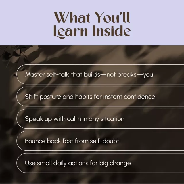 • Your Confidence Toolkit: Powerful tools to transform your thoughts, body language, and daily habits.