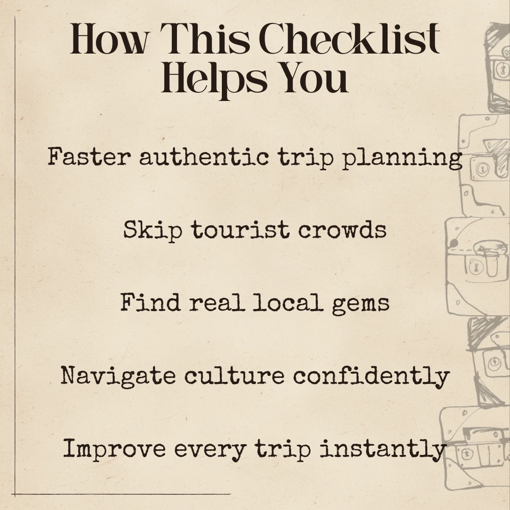 This checklist is ideal for travelers who value authenticity, cultural depth, and meaningful connections. It’s especially useful for digital nomads, solo travelers, slow travelers, and anyone wanting to go beyond basic search-engine recommendations.