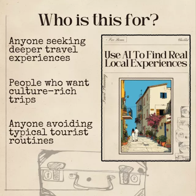 If you’re tired of copy-paste tourist itineraries and want to explore destinations the way locals actually live, this digital checklist is your new favorite travel companion. Use AI to Find Real Local Experiences is an actionable, beginner-friendly guide designed to help you tap into ai that suggests authentic local experiences so you can uncover meaningful, community-rooted activities anywhere in the world. Whether you’re planning a weekend getaway or a long-term adventure, this tool helps you cut through generic suggestions and craft a trip that feels genuinely connected and culturally aware.
