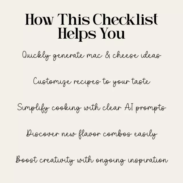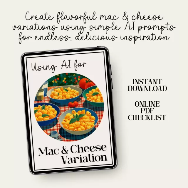 Download the Using AI for Mac & Cheese Variation Checklistย today and start crafting delicious, personalized mac and cheese creations in minutes. Your next flavor masterpiece is just one prompt away!