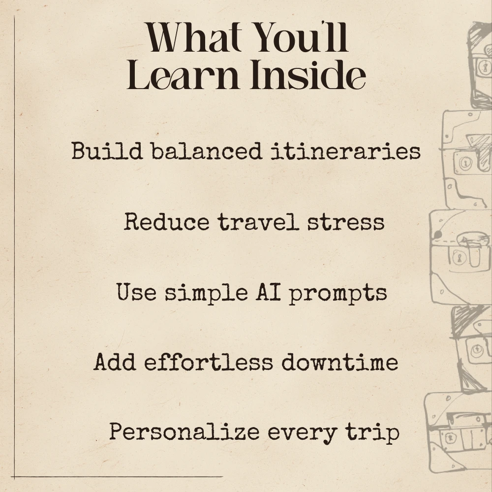 This digital resource doesn’t just teach you how to plan with AI—it teaches you how to plan with intention. Unlike generic itinerary templates, this guide focuses on creating space to breathe, supporting both productivity and relaxation. It blends practical AI guidance with the psychology of travel, giving you a holistic approach that other eBooks and checklists rarely offer.