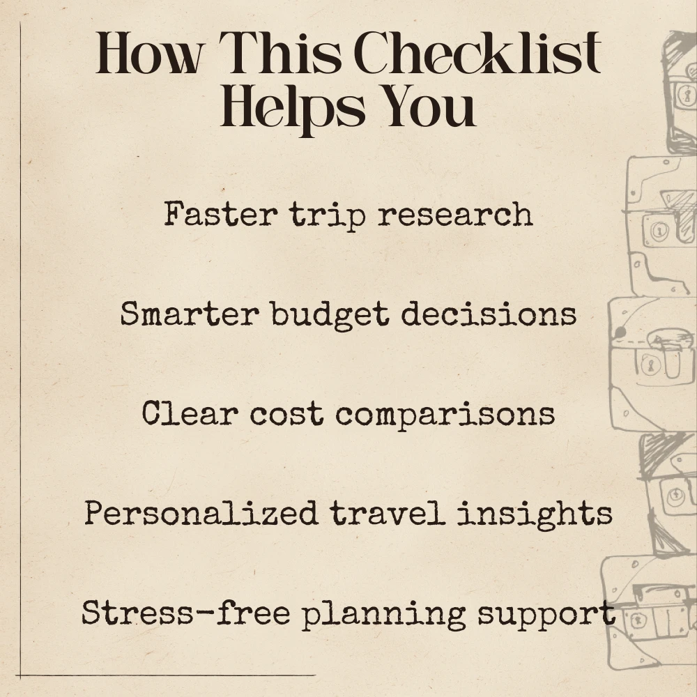 This checklist doesn’t just tell you what to do—it shows you *how* to do it using real AI prompts, practical examples, and a structure that keeps your planning organized. Unlike generic travel planners, this resource is purpose-built for people who want to use AI to compare vacation costs and unlock smarter travel strategies without complicated tools.