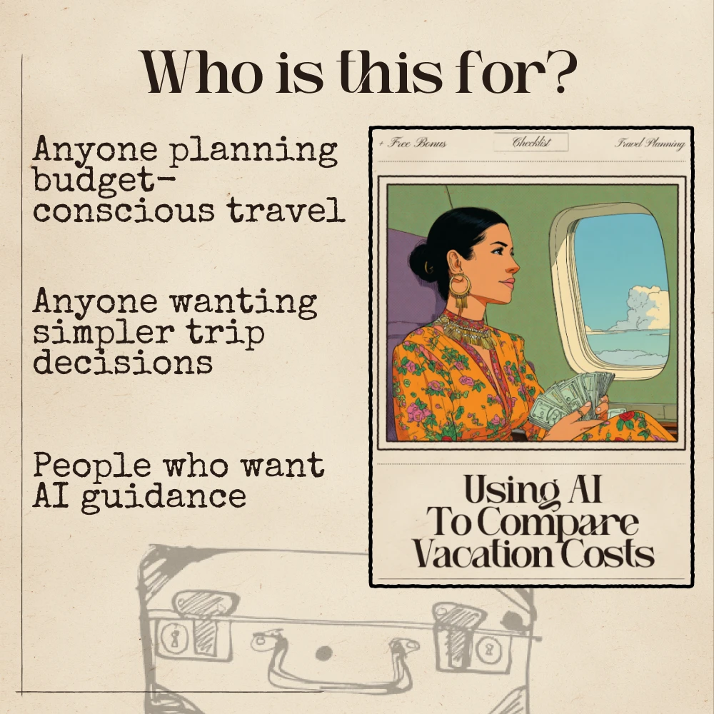 • Done-for-you AI prompts for flights, accommodations, and full trip cost comparisons.